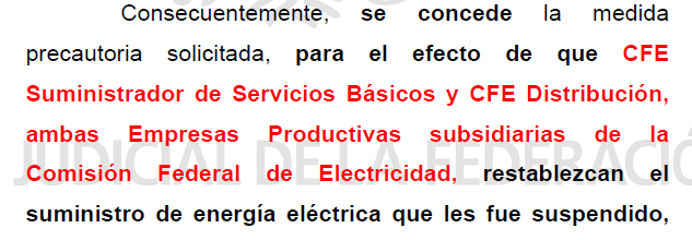 Dicha resolución fue remitida al Juez de primera instancia, admitiendo la misma y ordenando a la CFE que reconecte el servicio de energía eléctrica, tal y como se observa a continuación: