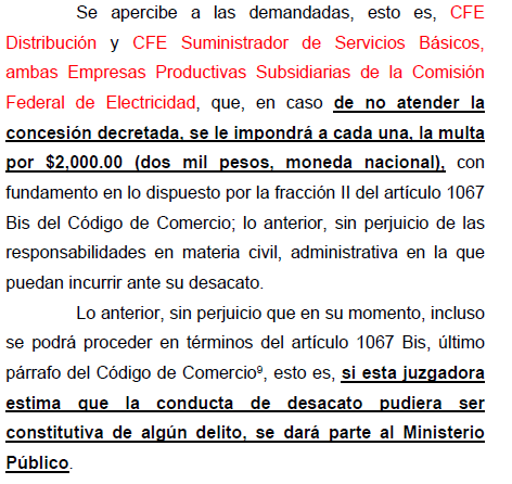 Incluso El Juez apercibió a la CFE con multa y/o dar parte al Ministerio Público en caso de desobedecer la orden de reconexión., tal y como se aprecia a continuación: