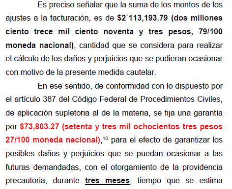 Es importante señalar que para que surta efectos la medida cautelar el Juez Fija una garantía, en este caso consideró los daños y perjuicio que podría sufrir CFE por no disponer con el dinero de los ajustes (intereses) por el plazo de 3 meses, plazo que consideró que duraría el juicio.