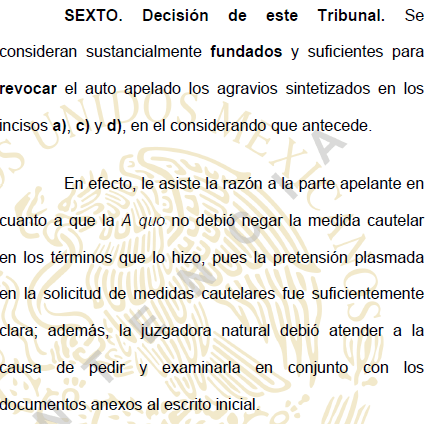 En el asunto de nuestro interés, se presentó la solicitud de medidas cautelares pidiendo la reconexión del servicio de energía electrica previo a promover la demanda, siendo que el juez desecho la solicitud, ante ello, se interpuso el recurso de apelación, mismo que fue aceptado y tramitado por el tribunal de apelación y resolviendo conforme a lo solicitado, tal y como se observa a continuación: