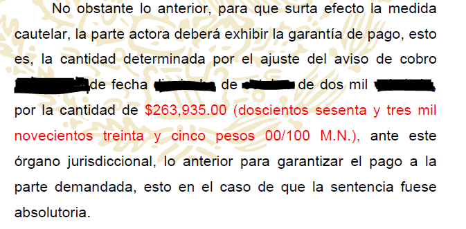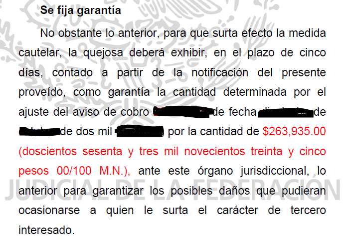 Cierto, recientemente un Juez mercantil en el Estado de Morelos fijó como garantía el total del monto fijado en el ajuste a la facturación, mismo que fue por la suma de $263,935.00 pesos, tal y como se aprecia a continuación: