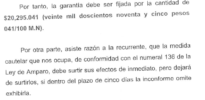 Ante este hecho se impugnó dicha resolución ante un Juez de Amparo, quien, concedió la suspensión para que se regenere el suministro de energía eléctrica, pero sorprendentemente, fijó como garantía el total de la suma por la que CFE fincó el ajuste a la facturación, es decir, la cantidad de $263,935.00 pesos, moneda nacional, lo cual es incorrecto.
